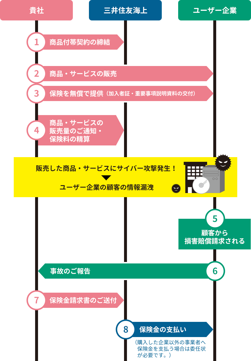 商品付帯方式を採用いただくことによって、対象の商品・サービスのネットワーク接続に関連して、購入した(または利用した)企業がサイバー攻撃を受け、情報漏えいやそのおそれが生じた場合に購入した(または利用した)企業が被る損害賠償責任や対応費用を補償する保険を購入者に無償で提供することができます。