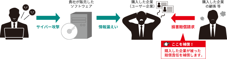 その場合、発生させた情報漏えいにより購入した企業が被った賠償責任を補償します。